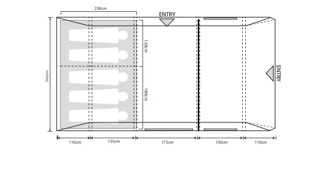 - Â 230cm deep, darkened Twilight micro polyester 5 person bedrooms with a 2/3 zip in divider