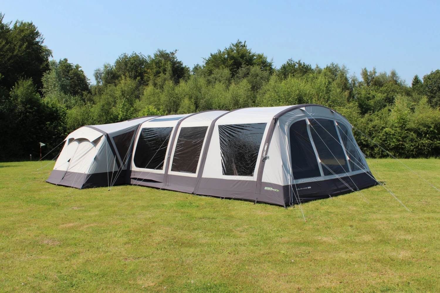 We have introduced a coordinated Kalahari Porch Extension which is designed to zip onto the front of the seven berth Kalahari PC9 DSE family tent, to considerably extend usable utility space from the integral front vestibule, using a sealable canopy extension for alfresco cooking or relaxation, featuring an excellent vista of the outside world through an enclosed windowed multi-position front door panel and complete protection against the elements, ensuring maximum enjoyment throughout wet weather. This canopy extension can be effortlessly pitched through our Oxygen Air Frame System, comprising a single point inflation high-pressure air tube, the famed Dynamic Speed Valve and an exclusive Pressure Relief Valve, which prevents damage to the tube by expelling any excess air above 6PSI, generally caused by overinflation or fluctuations in the ambient temperature. These valves have been discretely concealed with a Velcro cover. A bag of steel ground pegs, high visibility guylines and a compact carry bag have been packed inside this accessory